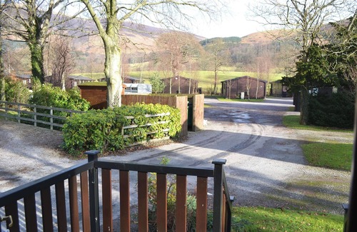 Luxury pine log cabin situated in landscaped grounds with panoramic views of the Lakeland Fells.. 3 steps to entrance.