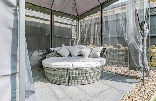 The property features a spacious first-floor bedroom with a sumptuous king-sized bed. An en-suite shower room equipped with modern fixtures, a rainfall shower, and elegant tiling. The ground floor boasts an open-plan layout, seamlessly blending the kitchen, lounge, and dining areas into a cohesive and inviting environment. The kitchen is fully equipped with top-of-the-line appliances, sleek cabinetry, and a stylish breakfast bar that comfortably seats two. Adjacent to the kitchen, the lounge area is furnished with plush seating, a large flat-screen TV, and contemporary décor, creating a cosy yet sophisticated atmosphere. Large double doors make a great invite into the private garden to the rear. Step outside to discover a private, enclosed garden at the back of the property, offering an oasis of relaxation. The garden features a BBQ area, outdoor furniture for alfresco dining, and a charming pergola that provides shade and enhances the ambience. This outdoor space is perfect for enjoying leisurely afternoons and evenings, making this holiday a Yes retreat. Wander upstairs to find a large master bedroom, a spacious first-floor bedroom with a sumptuous king-sized bed. An en-suite shower room equipped with modern fixtures, a rainfall shower, and elegant tiling.
