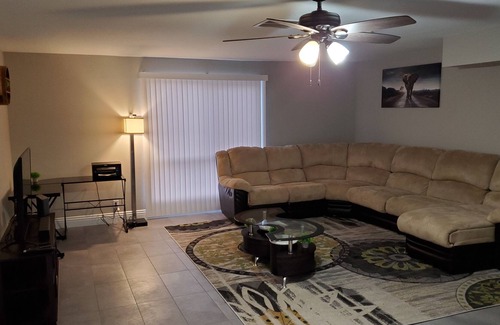 The upstairs bedrooms each have a wall mounted 50inch HDTV and queen size beds. The downstairs two bedrooms are each equipped with 2 full size beds each and individual ac/heat units. The upstairs master bedroom also has a balcony which over looks the pool and backyard. The dinning room view is to the lights of Las Vegas blvd! The kitchen is fully updated with stainless steel appliances. The basement has a spacious living room with equipped with a sectional couch which turns into a pullout bed, and a 50 inch tv with speakerbar. All TVs have cable as well. There is also a inground pool, grill, and many more bonuses. This neighborhood is very safe and quiet.