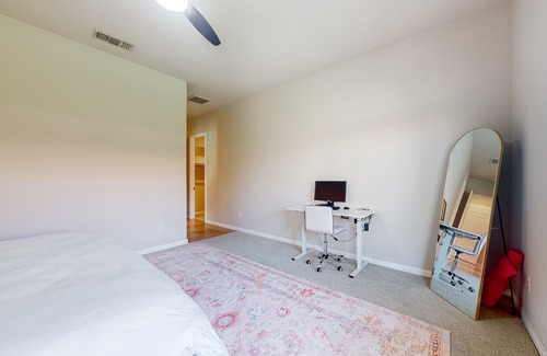 The primary bedroom features a desk for remote work and a huge walk-in shower in the en suite bathroom.