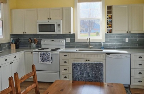 This charming cottage underwent a large renovation in Spring 2023, and is ready to greet you with modernized and sparkling spaces. In addition to 3 bedrooms and 2 ½ baths, there is a separate office equiped with a sit-stand desk and monitor - and a lovely view of the lawn and beach - so that you can work or take necessary meetings in a quiet space while the kids play. Of course it has our Veranda Beach signature fully equipped kitchen right down to the corkscrew & milkshake maker. You will love the two screened verandas, perfect for leisure & casual dining. And, it's only a minute walk across the lawn to the soft sand beach and clear waters of Lake Osoyoos!