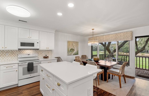 This Fairway Oaks villa has a two-story townhouse layout with the bedrooms on the first floor and the living areas on the second floor. The villa's open living area welcomes you with long views of Cougar Point Golf Course and its sparkling lagoon. Enjoy relaxing in the living room, where plenty of seating surrounds a flat-screen TV. A queen sleeper sofa offers additional sleeping accommodations for two. The adjacent dining area boasts uninterrupted views of the golf course and opens to the kitchen. Prepare your vacation meals in the fabulously renovated all-white kitchen. A large center island provides additional prep space and bar stool seating.