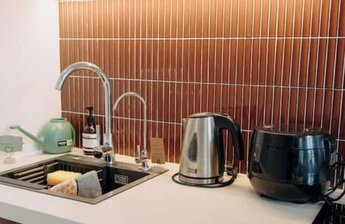 - The shared living space is fully equipped: Right from the entrance, there will be a shared living room with a full cafe counter, sofa, tea table, air conditioning, and ceiling fan.