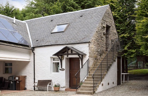 Wet Room: Shower, Toilet. Biomass central heating, electricity, bed linen, towels and Wi-Fi included. Sitting-out area with garden furniture. 30-acre grounds and woodland (shared with other properties on site). Children’s play area (shared). Tennis court (shared). Salmon and trout fishing on-site (shared). 1 pet welcome (to be kept on lead at all times, working farm estate). Bike store. Private parking for 2 cars. Wheelchair access. No smoking. Please note: There are several steps, sloping banks, stream and ponds in the grounds. The property has a natural water supply from a borehole. . Escape to this exquisite location surrounded by spectacular scenery with lochs, mountains and waterfalls in the heart of the Loch Lomond and the Trossachs National Park, at the edge of Ben Lawer’s Nature Reserve.