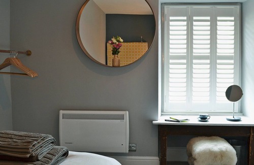 Bathroom: With shower over bath, toilet and heated towel rail.. Electric central heating (underfloor in bathroom), electricity, bed linen, towels and Wi-Fi included. Travel cot, highchair and stairgate. Welcome pack. . Public car park, £1.50 per day. No smoking.. Situated in the heart of the colourful, picturesque and historic town of Llandeilo, No.5 at Ginhaus sits within an 18th-century town house. The duplex apartment offers stylish and contemporary accommodation spread over the first and second floor. It is elegantly furnished with both a vintage and contemporary style. The staircase has a hand-crafted stained glass window and there are two spacious bedrooms and a luxury bathroom with a unique floor made up of penny coins. Llandeilo is right on your doorstep, and perfect for a weekend break, or a longer stay. Guests are welcome to bring their dog on holiday at no extra charge, but please note that the apartment does not have a garden or outside space. There are lots of lovely walks in the area though! There is an array of independent businesses including a famous chocolate shop, boutiques and many restaurants and cafés dotted around the town. Llandeilo is fast gaining the reputation as a leading independent shopping and eating destination in Wales.