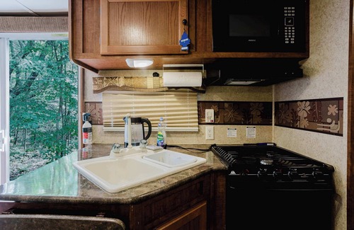 Step inside our charming 2-bedroom camper trailer, a cozy retreat nestled in the heart of Georgian Bay's wilderness. This mobile home offers a comfortable and functional layout designed for relaxation and enjoyment. The main bedroom features a queen-size bed, providing a peaceful sanctuary for a restful night's sleep. The second bedroom is equipped with a single bed and a bunk bed, perfect for accommodating children or additional guests. The bathroom is a full bathroom, offering all the necessary amenities for your convenience. The living room provides a shared space for relaxation, with a sofa bed for extra sleeping space. The kitchen is equipped with essential appliances, including a refrigerator, microwave, stove, and kettle, allowing you to prepare meals with ease. Enjoy the convenience of a private entrance and free parking on the premises. Outside, you'll find a BBQ grill for outdoor cooking and access to the nearby beach and lake, offering endless opportunities for fun and exploration. This camper trailer is designed to provide a comfortable and memorable experience for all guests.