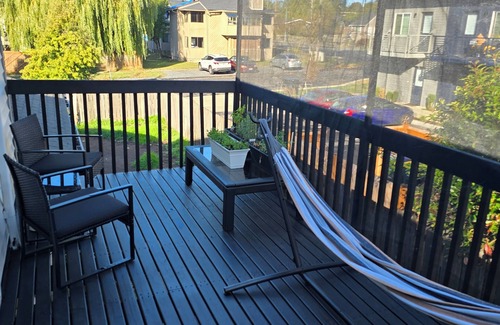 The main bedroom offers a cozy retreat with fresh linens, plenty of storage, and soft lighting for restful nights. The second room has been set up as a dedicated office space, complete with a desk and chair — perfect for remote workers, students, or anyone needing a quiet place to focus. One of the best features is your private deck, where you can sip morning coffee, enjoy fresh Bellingham air, or unwind after a day of adventure. Please note: the yard is currently under development, so while you’ll have outdoor space, there is no grass yet.
