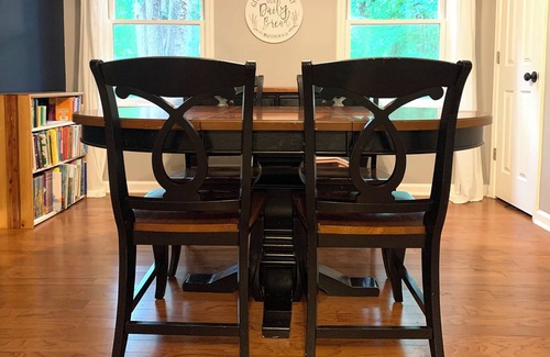 This rental has an outdoor grill (bring your own gas), a fire pit and a creek at the back at the property for those who love to cook and entertain outside. The kitchen is fully equipped with all the amenities guests need to prepare delicious meals. The dining room has a stunning view of back of the property and is perfect for enjoying meals with friends and family.