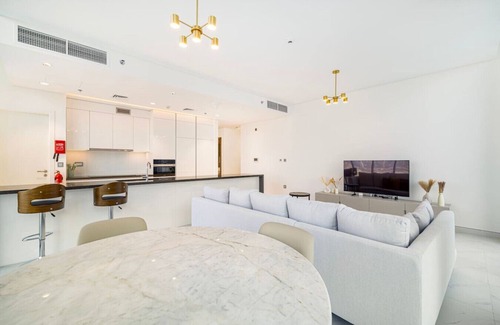 Experience luxury in this elegant 2-bedroom apartment in MBR City with breathtaking Burj Khalifa views. Relax in the spacious living area, cook in the fully equipped modern kitchen, and unwind on the private balcony. The building features a rooftop pool, gym, and 24/7 concierge. Located minutes from Downtown Dubai, Dubai Mall, and Meydan One, this is the perfect retreat for families, couples, or business travelers. Book now for an unforgettable stay!
