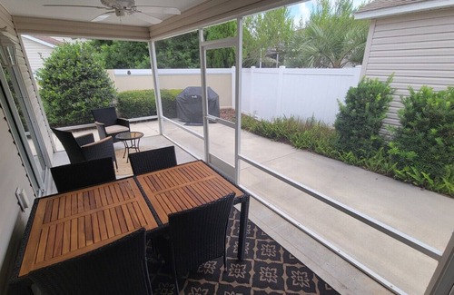 Welcome to your beautiful home on Fiddlewood Place! This open-concept, 3 BED, 2 BATH courtyard Villa is located in the popular, centrally located Village of Pennecamp. Convenient to amenities: LAKE SUMTER LANDING & BROWNWOOD TOWN SQUARE w/nightly entertainment, executive/championship GOLF COURSES, REC CENTERS, $ SHOPPING. Guest bedroom has a BUILT-IN MURPHY BED & HIDE-AWAY DESK, living area opens to the SCREENED LANAI, PRIVATE yard with large patio, 1.5 car garage, & GOLF CART INCLUDED!