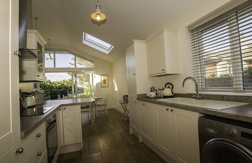it is very cosy. Rhosneigr is famed for its water sports whether it’s sailing, windsurfing, kite surfing, kayaking or fishing with tuition available if you are a beginner or looking to refine your technique. But there is so much more and this house is the perfect base to make the most of everything there is to offer in Rhosneigr and in the surrounding area. A short walk down Chelford Close brings you to the edge of the sand dunes and to a safe sandy beach perfect for games with the children or walking the dog. There is also an 18 hole golf course, bowling green and tennis court close-by, or you can walk to the village and enjoy the shops (general stores, Gecko, Fat Face, Fun Sport) cafes, bars and restaurants or you can just relax in the secluded garden. Erw Wen has been carefully refurbished and has a modern open plan kitchen, living and dining area and has been carefully designed and furnished to make it the perfect place for family and friends to get together and enjoy every moment of a seaside holiday. The interior of the house is practical and comfortable with every modern appliance to make your holiday as relaxing as possible. The floor to ceiling windows in the main living area provide lovely views to the decked patio area and into the large lawned garden – perfect for small children and dogs. Patio table and chairs are provided, so you can enjoy the large, secluded garden. The kitchen features an electric oven with microwave, ceramic hob, large fridge freezer, dishwasher and washer/dryer. There is a separate lounge, which has two comfy sofas set around an open fire, with Smart TV and DVD player. The main bathroom has a bath, shower over the bath, washbasin & toilet. There is also a shower room with a walk in shower and toilet and there is an outside shower to rinse off the sand. There are two double bedrooms with double beds and the third has full size bunk beds. All bedrooms have wardrobes and chest of drawers. There is gas central heating, which means that you can enjoy Erw Wen all year round. Constant hot water is always available.