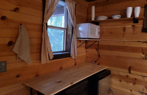 A separate sleeping cabin with a covered front porch (6' x 16') spanning the length of the cabin where you can cook on your propane grill or relax and listen to nature at your 2 person dinette. Your firepit and picnic/seating area are just off the steps.