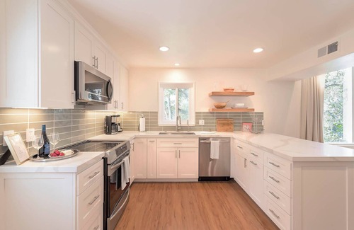 The mid-century 3-bedroom, 2-bath home has a secluded ambiance in a quiet neighborhood close to downtown Monterey, with newly renovated rooms and décor throughout. The home features a split-level floor plan with a spacious great room style kitchen-dining-family room space on the bottom level.