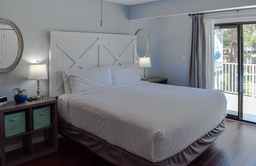 Primary bedroom King bed, private bathroom with tub/shower combo and a glass door out onto a balcony with a great view of the back area.