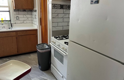 This home is located in a developing neighborhood with lots of renovation projects. The neighborhood is quiet & safe with minimal traffic. This is 3-bedroom bungalow-style ranch house with hardwood floors with full basement including laundry facilities. All bedrooms and bathroom are on the main floor. Each bedroom has a remote-controlled ceiling fan with all bedding needs. The newly renovated bathroom features a walk-in shower including basic toiletries. The kitchen is stocked with the basic cooking & eating utensils & cleaning supplies. Starter supplies for short stays (less than 28-days) of paper towels, toilet paper, laundry detergent, dish liquid and general cleaning supplies are supplied. The doorways and corridor are narrow and not well-suited for wheelchairs or wide-walkers.