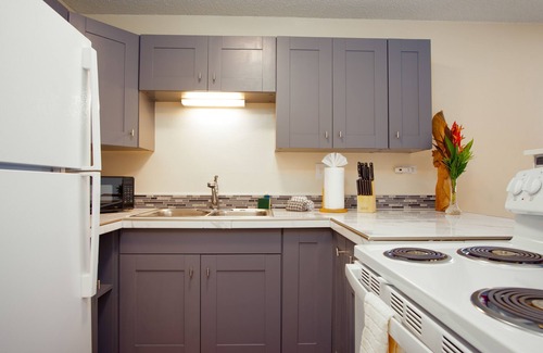 This third-floor home away from home offers an inviting atmosphere with everything you could need to experience a tranquil getaway. There is a coin-operated laundry area with a security door that will available for you. Inside, this airy condo has a cozy living area where you can spread out comfortably and rest after a terrific day exploring the surroundings and downtown Hilo. Watch a favorite show on the TV and then treat yourself to a delicious snack or homemade meal prepared in the well-appointed kitchen. There is an AC unit in the bedroom for added comfort and books and puzzles for your entertainment.
