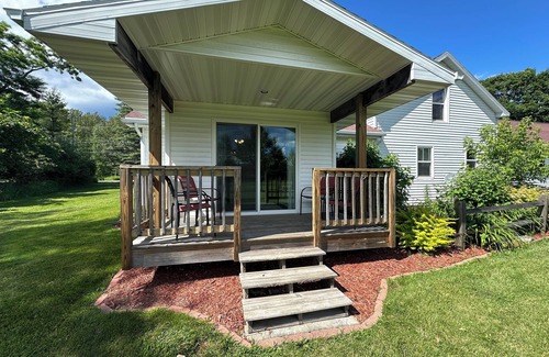 Originally built around 1900 as a log cabin, this house has been renovated with new roof, windows, cabinets, flooring, and bathrooms. The formal dining room and second bathroom showcase exposed logs, preserving the home's rich history. The home features two bedrooms on the main floor and two more upstairs. Guests can also use the large two-stall garage and appreciate the peaceful 3-acre property. The large living room includes a fireplace crafted from original Door County limestone, now equipped with a gas insert for quick warmth. The primary bedroom has a king-size bed and patio doors opening to a covered deck overlooking the backyard, perfect for wildlife viewing and morning coffee. The first floor includes a second bedroom with a queen-size bed, a kitchen with a breakfast table seating four, and a dining room accommodating eight. The main bathroom on this floor offers a tub/shower combination. Upstairs, one bedroom has a full-size bed with a half bath, while the other bedroom features two twin beds and a small sink area for convenience.