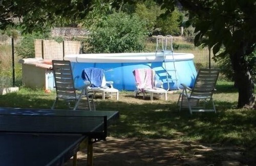 shared access with another gîte to an enclosed space with above ground pool (4.50m diam) and courtyard table for vehicles.