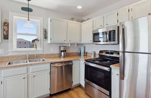 The Top Level Living Area is a dreamy spot with an open-concept floor plan and high ceilings that's perfect for family movie night as you enjoy plenty of natural lighting and a Flat Screen TV. Enjoy an updated kitchen with stainless steel appliances that comes perfectly stocked to prepare a tasty dinner, or grab a steam bucket from one of the nearby local seafood restaurants and bring it back to eat around the dining table! Get some peace and quiet in the beautiful separate Sun Room with gorgeous, recently installed picture windows (2024). Soak in views of the ocean, facing east, or turn west for sunset views to write home about. If you need to drop a line or email to the people back home, no worries! Blue Pearl offers free Wi-Fi and cable for all our guests. Make your way back to the additional King Bedroom with a Full Hallway Bathroom when you're ready to get some sleep so that you can enjoy another full day of Outer Banks adventures tomorrow!