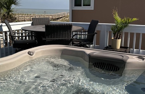 Epic ocean views from the new 14' deck. Soak in the brand new Bullfrog hottub and watch as ships pass and dolphins frolic! Watch the sunrise and enjoy a coffee or take 47 steps and watch it from the beach! BBQ with an ocean view then feast on the high top table with built in fire pit. Your house comes fully equipped to include beach chairs, umbrellas, and towels. Hit the beach and you're a 25 min walk to the pier, or a 2 min walk to view the light house from the sand. Enjoy your stay on the quiet side of Tybee, pictures don't do this property justice!