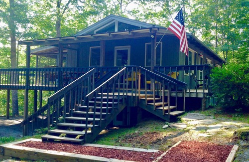 This Secluded 4 bedroom 2 bath Mountain Retreat, on a 5 acre parcel, is like renting your own Private State Park. The Cabin is within easy (4 minutes) walking distance to Slick Rock Mountains private 12 acre swimming and fishing lake! This 2 story family cabin comfortably sleeps 8. Upstairs is an open floor plan, living room/ kitchen/ dining room with King master bedroom and full bathroom. Downstairs is a 3 bedroom (queen, double, and trundle=2 twins) with another full bathroom and washer dryer. Also the downstairs has been recently remodeled with brand new wood tile flooring throughout. The cabin is loaded with all kinds of modern amenities, like flat screen televisions, wifi, huge fireplace and a well stocked kitchen!