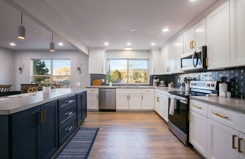 Fully renovated home with a welcoming front and back yard. Enjoy activities such as cornhole, horseshoes, ping pong, or simply sit by the fire pit. This house is truly two-in-one with the top and bottom level, each with a full kitchen, primary bedroom/bathroom, fireplace, and living area. Enjoy your morning coffee on the upper deck with gorgeous mountain views. Or, come down to the lower level and unwind in the yard. Bring the whole family to this great place with lots of room for relaxation and fun.
