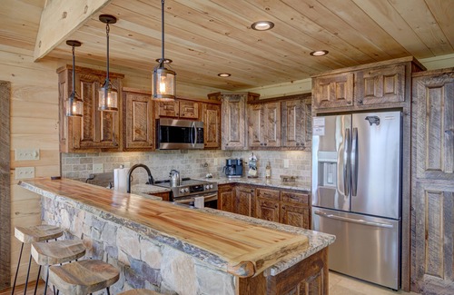 Spacious floor plan with large windows and fireplaces (Please note that gas fireplaces in this cabin are only operable September-April as they heat entire cabin.) on every floor to enjoy the mountain views in any weather. The main floor features an open living space with comfortable seating, smart tv, as well as a large dining table. Well stocked kitchen with modern appliances and farmhouse sink makes mealtime a breeze.