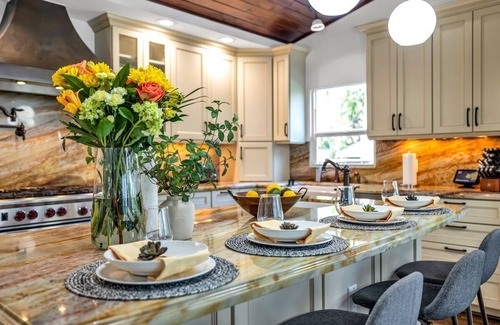 Our kitchen is ready for any culinary challenge, equipped with top-of-the-line cooking appliances and spacious granite countertops, including an island that provides ample space for preparing meals. The kitchen flows into a charming dining area with a table that seats eight and an additional island seating for four. Just outside, a sitting area in the backyard offers a lovely spot for drinks or a casual meal.