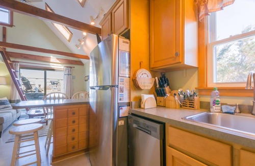 Walk by just one cottage to the Association beach from this contemporary yet cozy cottage with plenty of privacy. This wonderful getaway features an open Living room/Kitchen with cathedral ceilings, skylights, ceiling fan and gas fireplace. Kitchen offers counter top dining.