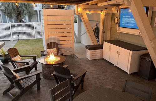 Enjoy the large DECK on the kitchen/den level with child safety gate for a meal at the outdoor table, relax in one of the two rocking chairs or use the gas grill that makes outdoor cooking convenient. We even provide propane for the gas grill. The fenced-in BACKYARD is great for children. There is even a retractable gate at the bottom of the stairs at the pool area to keep little ones safe from playing on the steps. Cool off in the beautiful saltwater POOL, lounge in a chaise or just hang out at the bar, seating area or outdoor table located on the POOLSIDE COVERED PATIO which also features a 60" TV & Bluetooth Speakers. FIREPIT is available Sep - May. Pool toys and lawn games including a soccer ball, football, cornhole, badminton and other outdoor games are provided in the outdoor storage box to enjoy a little competition. Pool heat is available Mar, Apr, Sept & Oct (Mar & Nov weather permitting) at an additional charge and paid directly to the owner. The OUTDOOR SHOWER with Hot/Cold water is convenient for washing off the sand before you enter the house or pool and has COMPLIMENTARY shampoo & conditioner. There is a basket of sand toys located there for the little ones to enjoy playing in the ocean sand. There is an outdoor gathering area in the CARPORT with a porch swing and Adirondack chairs to enjoy the shade and ocean breezes and a great rainy-day location for cornhole and other games. The FRONT PORCH has two rocking chairs, child safety gate and a view of the waterway.