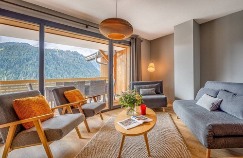 You'll have a great time in the warm, modern living room, which opens onto a large balcony with views over the valley.