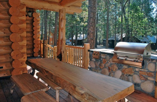 El Capitan IS Yosemite's Splendor (featured in Log Home Living magazine)! This spacious, Platinum rated, 4 bedroom, 4 bathroom home has become one of the most popular luxury vacation homes in Yosemite National Park. El Capitan sleeps up to 12 guests and has added amenities such as jetted tubs in 2 of the bathrooms, and gas fireplaces in 2 of the master suites. There are large, flat screened satellite TVs in the Great Room and in all of the bedrooms, and WiFi. Handcrafted log ceilings and walls, carved archways, log posts, a log staircase, and carved animals complete the mountain feel. Each bedroom has its own detailed theme. All bathroom amenities are upgraded. The home has a washer and dryer. The great room has a large rock fireplace (firewood provided in season) and plenty of comfortable seating for family gatherings. The kitchen boasts a 48" American Gas Range with a center griddle and 2 ovens, a sub zero, side by side refrigerator/freezer large enough to accommodate party trays, a dishwasher, and a granite topped serving island, (caterers love this kitchen)! The dining area has a copper-topped dining room table that seats 12. The game room has a pool table and a beautifully made armoire containing a Murphy bed. The beautiful, private deck has a very large picnic table and a built in gas grill. The entrance and downstairs are wheelchair accessible. We call this the "Oh My Gosh" home! No smoking, No pets. "EV Charging Station available within five miles of the cabin"