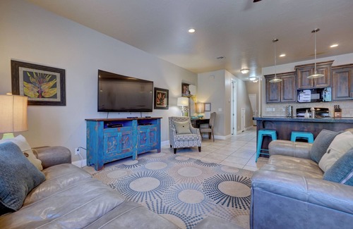 "South Beach" is located in the exclusive golf community of Coral Ridge Resort and is perfect for your next Southern Utah getaway. Featuring four bedrooms and two and a half bathrooms, this home features a king in the main floor master, king in the second bedroom, and queens in the third and fourth bedrooms. The leather queen sofa sleeper includes a queen memory foam mattress, while each of the bedrooms boasts plush cool gel memory foam pillowtop mattresses for your most comfortable nights away from home. All bedrooms and the main living area have ceiling fans for extra cooling features. The kitchen is fully stocked to meet your cooking needs and includes granite countertops and a travertine backsplash, beautiful appliances, a gas stove, toaster, blender, hand mixer, coffee maker, crock pot, and much more! This home includes cable TV on the new Samsung curved 65 inch UHD smart TV in the family room, and large flat screen smart TV's in the master and second bedrooms, capable of connecting to your personal accounts such as Netflix, Hulu, etc. Each TV is accessorized with blue ray players and over 50 mgs of high speed wireless internet.