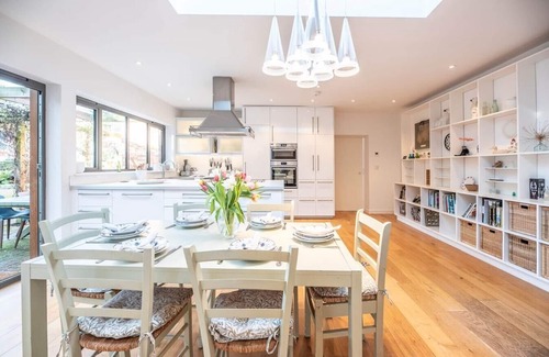 Daylight floods this room through the skylight, doors and windows to the garden. Kitchen units wrap around in a U shape housing a waist-height electric oven and microwave above it, a four-ring gas hob with extractor, a large (5 shelves) fridge and freezer (3 drawers), a dishwasher, a toaster, a kettle, and a compact 200xl Magimix. If you enjoy dining at home there’s a kitchen table with six chairs next to doors opening into the courtyard and shelving runs along the wall with a great library for you to choose from.