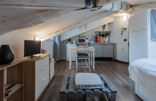 The apartment, located on the third floor reachable on foot, opens onto the small but nice open space which features an open-plan kitchen fitted with a microwave, a toaster and a juicer, in addition to a dining table. The room, decorated with beautiful exposed wooden beams, comes with a sleeping area which consists of a comfortable double sofa bed and a dresser with a TV. A bathroom with shower and washing machine completes the accommodation.