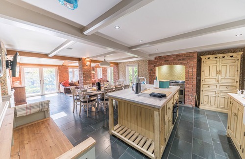 In the modern extension, an open-plan kitchen, dining, and living area provides a bright and welcoming space for socialising at any time of day. Exposed brick walls and beams lend character, while picture windows and French doors flood the room with natural light. The well-equipped kitchen includes a range cooker, fridge, microwave, and dishwasher, making it easy to prepare delicious meals. Gather around the spacious dining table to share stories of your day, then relax on the large L-shaped sofa in front of the satellite TV. The adjoining sunroom is perfect for morning coffee or a lazy afternoon.