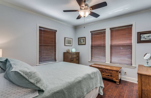 We’re glad you chose to stay in the Captain’s Quarters! We’ve made every effort to create a comfortable, homey environment for your extended stay. Right away, you’ll notice there is a nautical feel to the place – an homage to Admiral Charles D. Grojean, the patriarch of our family. His colorful and illustrious career as a nuclear submariner is reflected in the décor, particularly in the upstairs family room where the memorabilia of the ships he commanded resides. The house itself was built in 1949 as a duplex. It has survived several modifications to the original floorplan, including the genesis into a single-family dwelling. Its most recent reincarnation came from our desire, as the nextdoor neighbors, to bring it back to something resembling a mid-century style home that fits with the neighborhood, and a dwelling we’re proud to share a boundary with. It has an open concept floorplan, two bedrooms downstairs, two up and another bedroom we converted to a laundry room. There's a spacious game/family room upstairs with a 50' TV and tile floors. The rest is hardwood. The big, screened in back porch is perfect for morning coffee or family gatherings. The home is sited within the award-winning Alamo Heights School District and within walking distance to fine restaurants and shopping. We, the owners, live next door. There is a garage apartment in the back where our 33 year old daughter resides. However, plantings that had not grown yet in these photos have created privacy. We will accept month - to - month or longer and the monthly rent will adjust down for longer stays. We are pet lovers and accept pets but want the right to approve the animals. There is parking for one car available in the driveway. A second car would need to park on the street.