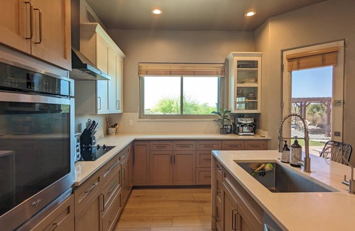 This 4 bedroom + loft / 3 bathroom home on a dead-end street has everything you need to fully relax and enjoy Arizona. Upper level: Master with loft (has sleeper sofa). Downstairs: 2 bedrooms and full bath on one side of the home. 4th bedroom with attached en-suite on other side of home. We have a full-size washer and dryer, a kitchen stocked with the necessities, multiple TVs, 2 car garage parking, backyard with pool, BBQ, fire pit, putting green, pool / ping pong table..... and the list goes on! Saltwater pool is HEATED for a small extra charge per night.