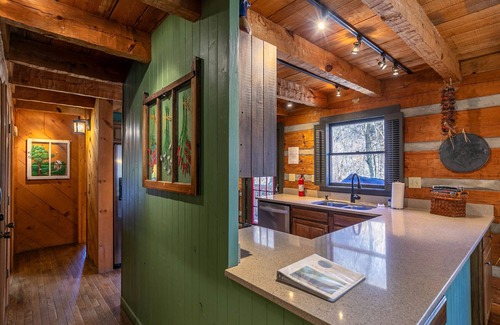 This cabin provides a cozy feeling with hand-hewn hemlock logs and beams, leather furniture, oak floors, area rugs and a stone fireplace with firewood provided. Original artwork and pottery along with track lighting with dimmers accent the main level. A surround sound TV/DVD/CD system with streaming services and SlingTV for regular programming and high speed wireless internet provide entertainment. The kitchen features stainless steel appliances and granite countertops. One bedroom with a king size bed, flat screen TV and a full bath with a granite top double sink vanity and Jacuzzi tub complete this floor inside.