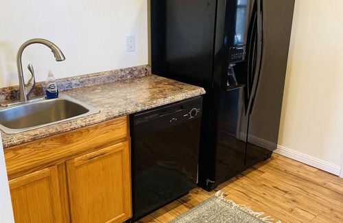 The main level includes the living room, master bedroom, fully stocked kitchen, and laundry room.