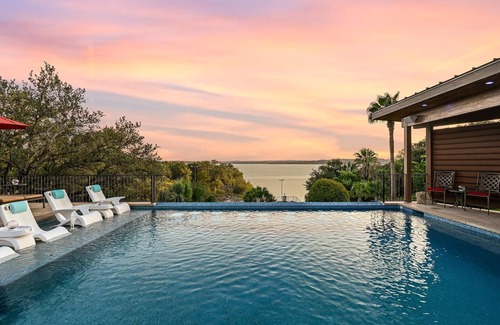 Welcome to the Palms Estate by ABOVE Vacation Residences - an entertainers dream! The main house is 3 stories with 2 living and dining areas, inside and outside, a game room with a pool table, theater, an office, and decks on every level with views of the lake. An brand new pool with amazing sunset views over Lake Travis and an oversized hot tub that seats 12. The 2-story Casita has 2 bedrooms, a full kitchen, living/dining room with an outdoor sitting area. The Palms is an ideal location to host small events- reunions, weddings, corporate retreats. This Mediterranean-style home is near the famous Oasis Restaurant, “the Sunset Capital of Texas,” and is a perfect launching point to explore Lake Travis and the Austin area. The property is regularly set for 13 guests, but, with homeowner approval, can host as many as 18 guests with luxury Frontgate beds which would also be set with ABOVE standard luxury linens. Additional fees may apply. All guests must be pre-approved to rent this estate. A full guest list will be required. Boat slip may be available by approval and with a fee.
