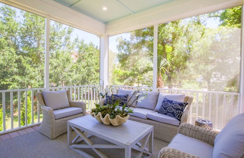 This is it! This is the gorgeous, get-away-from-it-all Seabrook Island vacation home you've been searching for! Newly constructed and impeccably designed, this exquisite home is conveniently located within The Village at Seabrook. This ideal location means that, as a guest of Whispering Palms, you'll have quick & easy access (for an additional fee) to nearby Seabrook Island amenities - including the Lake House community center, the Equestrian Center and the Racquet Club - as well as quick, easy & FREE access to The Village at Seabrook amenities, including two community pools, two pool houses and a picnic area & walking trail that overlooks Palmetto Lake. Bohicket Marina and Freshfields Village (where you'll find a grocery store, shops & restaurants) are a short drive away. Whispering Pines features two master suites (one on the lower level and one on the upper level), a bunk room with two custom built bunkbeds (for a total of 4 twin beds), a screened porch with lovely breezes and an open floor plan layout between the living room, dining area and kitchen. You'll swoon over the design details and high end finishes throughout this beautiful, custom built home including gorgeous tile work, designer wallpaper and top of the line appliances.