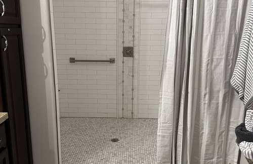The master suite is a haven of tranquility, featuring a plush king-sized bed and luxurious linens. The attached accessible bathroom boasts a roll-in shower, complete with handrails and a bench for added convenience. Every inch of this rental has been meticulously designed to ensure a comfortable and enjoyable stay for all.