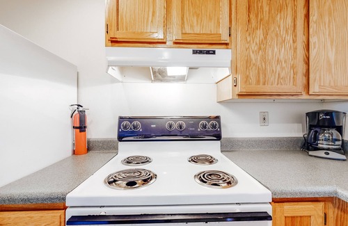 Chill out and relax at this charming beachfront condo, ideal for a small family or a quiet getaway for two. Inside, you'll find a well-equipped, full kitchen, an adjacent dining table with seating for four, and a comfortable living area with a large sectional sofa and a wall-mounted flatscreen TV. Step through the sliding glass door and out onto your patio, cross the yard, and descend the staircase that leads to a porch swing, firepit, and finally the beach itself.