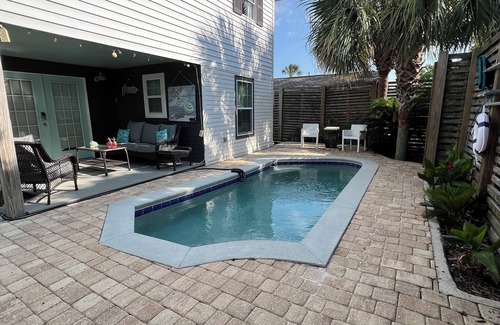 Imagine waking up to coffee on screened porch with a peek-a-boo view of the ocean, or having breakfast by the palm tree shaded pool area. Private backyard oasis, covered porch, screen porch, chimnea for S'mores. This cottage has 2 Bedrooms (1 King, 2 Queens), and 2 full baths each attached to each bedroom. This cottage is not only adorable and has everything you need inside... it has a breezy beautiful outdoor space. 7 min walk to beach or even shorter bike or cart-ride. Quiet street perfectly located under 10 minutes to Rosemary (30A) area or 10 min to Pier Park for IMAX, shopping, eating. Cute Golf Cart friendly streets where you can ride for ice cream, breakfast, pizza and to the local Carousel Market.