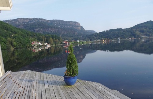 Welcome to this spacious cottage of high standard, beautifully and peacefully situated directly on the shore. Along three house walls leads a larger terrace; here you can relax, grill the day's fresh FIsh catch and enjoy the pretty panoramic view over waters and mountains. There is a boathouse, a jetty and a private bathing beach at your disposal and the fishing and bathing possibilities are very good. The area is child-friendly and there is great hiking terrain a short distance away. The Kongeparken amusement park and the Lysefjord are not far away. The boat driver must have experience with boat driving.