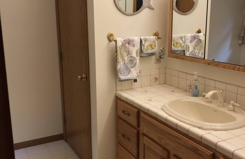 Our kitchen features oak cabinets-fully equipped with quality pots, pans, utensils & dishes. It includes a full size refrigerator, electric stove, microwave, dishwasher, coffeemaker, and toaster. The counter-top bar will seat 4 and the dining table will seat 8-10.