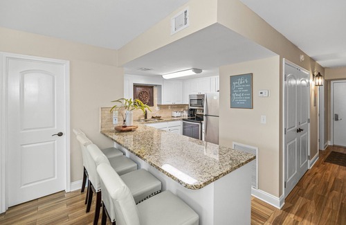 The kitchen includes stainless steel appliances and granite countertops. The living area has a queen size sofa sleeper that offers a memory gel mattress. There is, also, a loveseat available with extra seating and a 50" flat screen TV to watch all of your favorite movies and sports. The inviting front bedroom offers a queen sleigh bed with a new mattress and box spring. The front bath has been updated to include granite countertops as well. The master bedroom has stunning views of the gulf offering a new king size panel bed with a new mattress and box spring and a flat screen TV wall mounted at the foot of the bed. The master bath was updated to include a tile shower with a glass door. It, also, has granite countertops. Let the gulf winds blow as you relax and sit at the high top table and chairs located on the balcony where you mostly likely will see dolphins feeding and frolicking up and down the beach.