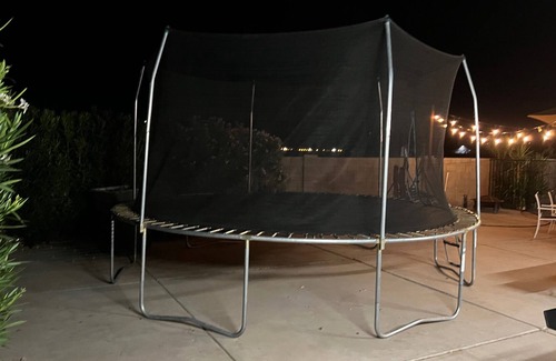Outside living area - Comfortable couch set with end tables under a covered patio area. Accompanied by 4 chair patio set with an umbrella and a 2 a swing set for 2 people. A dual BBQ pit for both gas and charcoal grilling accompanied by a mobile prep table. A 16' trampoline for the little ones with a safety net and access ladder. All the backyard is illuminated by both warm lighting hanging over the covered patio and 4' led mounted light bars easily accessible to turn on and off.