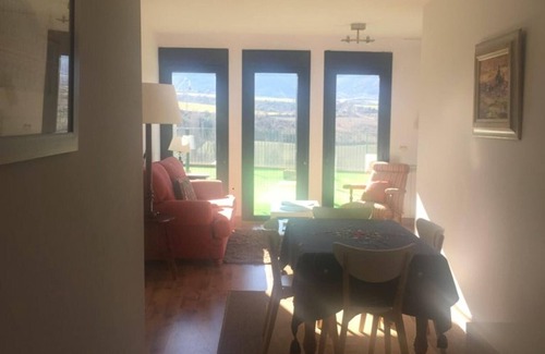 Piso en planta baja with spectacular views of the Oroel mountain, Distributed in two dwellings, one double and one quadruple, four complete bathrooms and a fully equipped independent kitchen. Have a spacious living room with a small terrace that you can unplug and unplug. The accommodation has a parking lot included with direct elevator access